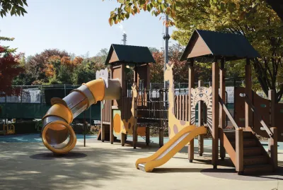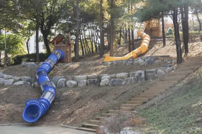 숲속 경사면을 따라 이어진 긴 미끄럼틀과 밸런스를 키우는 우드형 놀이시설까지!