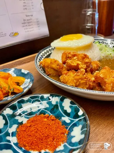 기본으로 제공되는 카레는 맵지 않아서 누구나 즐길 수 있는 맛이에요. 매운맛을 원한다면 매운 고춧가루를 제공해 주는데 취향에 맞게 첨가해서 먹으면 됩니다.