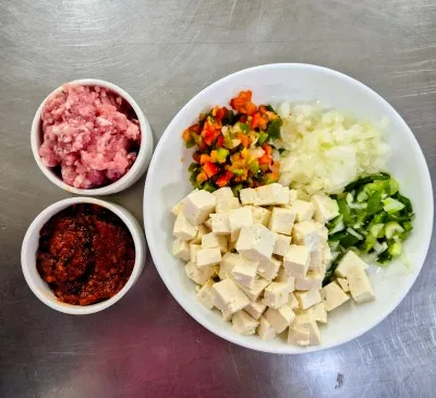두부 300g, 돼지고기 다짐육 100g, 피망, 양파, 당근, 다진마늘, 대파