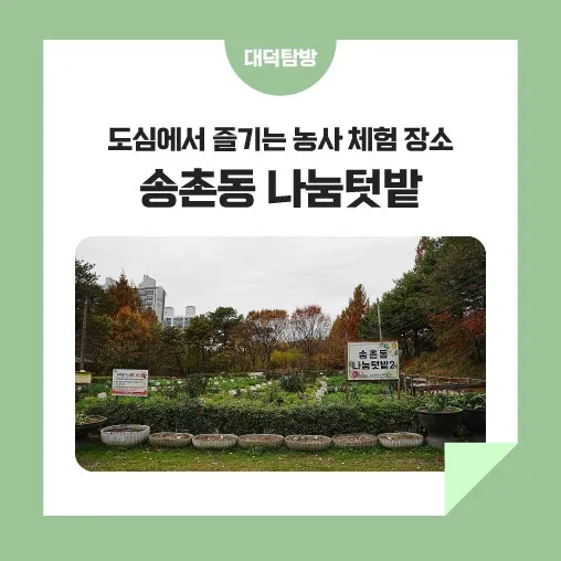 ​대덕구의 나눔텃밭은 목상동, 신탄진, 비래동 1,2 송촌동 1,2 법동 총 7개가 있습니다. 2월 말경에 분양 신청자를 모집하고, 4월부터 11월까지 자유롭게 할당된 구간을 이용할 수 있습니다.