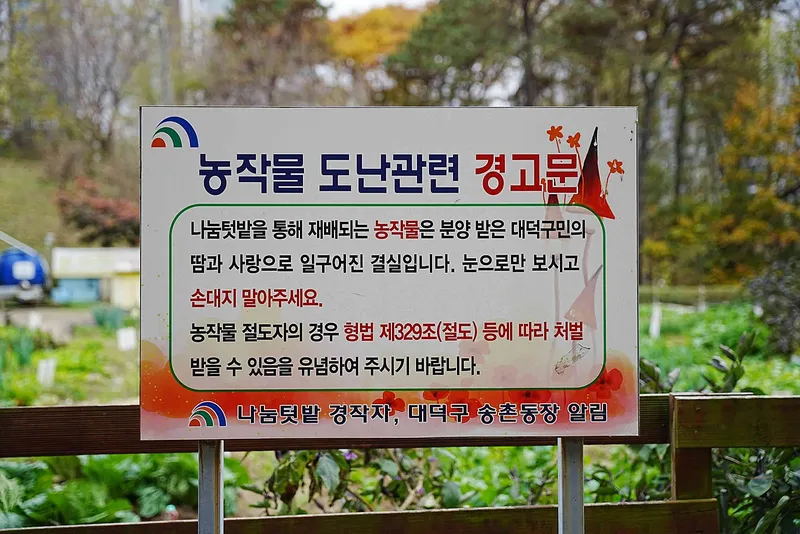 ​지금은 많은 분들이 도시 나눔텃밭을 알고 있지만, 아직도 잘 모르는 분들은 애써 경작한 농작물을 절취하는 분들이 있을 수 있어서 도난 관련 경고문도 붙어 있었습니다.