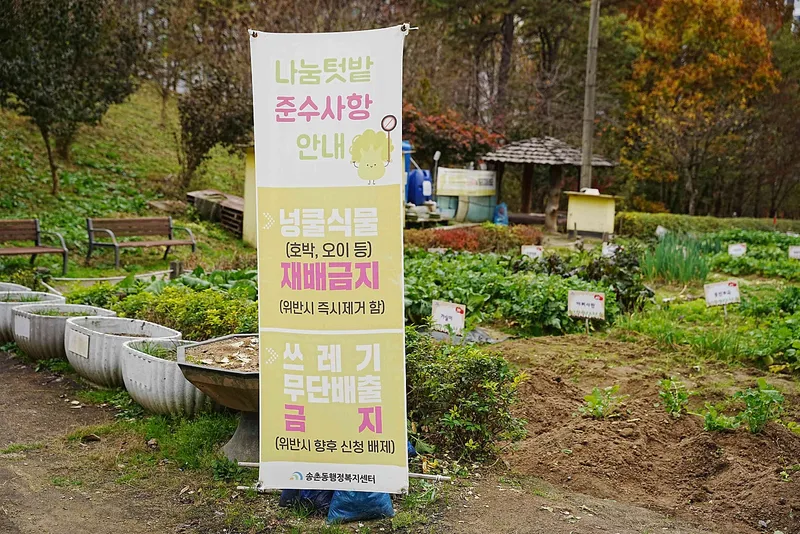 ​넓은 터에 여러 사람들에게 정해진 구획을 지정해 주기 때문에 다른 이웃의 텃밭에 해가 되는 부분은 경작을 금지하고 있습니다. 넝쿨식물 등은 재배하면 안 됩니다.