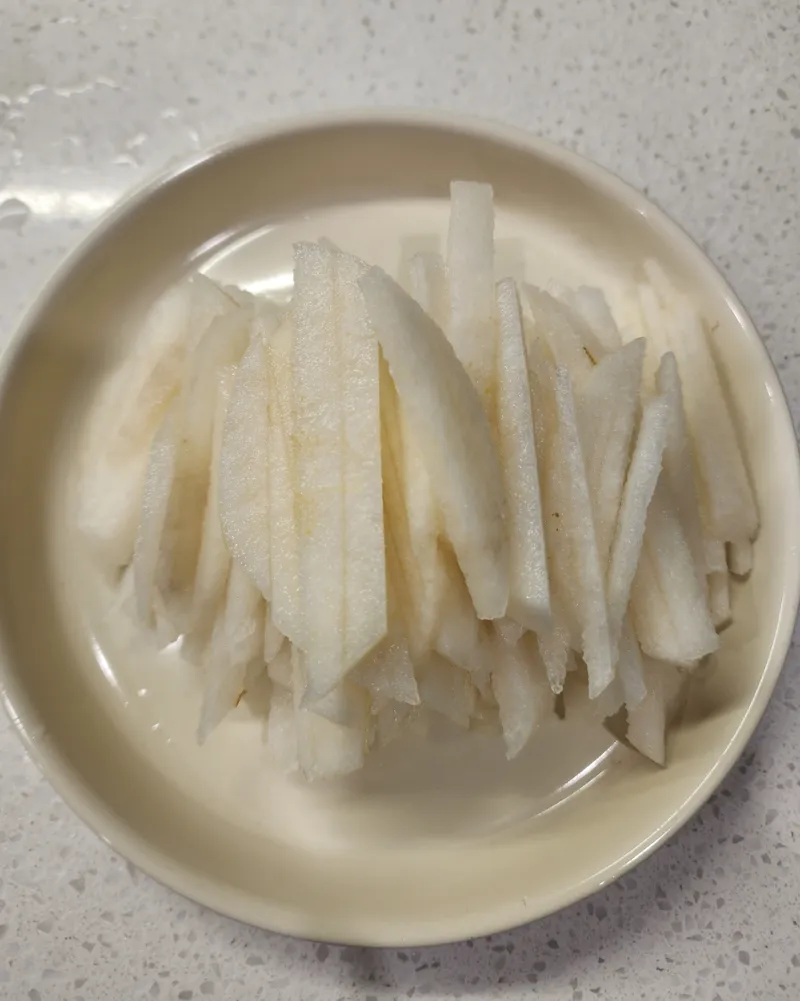 배는 먹기 좋은 크기로 얇게 채썰어 줍니다.