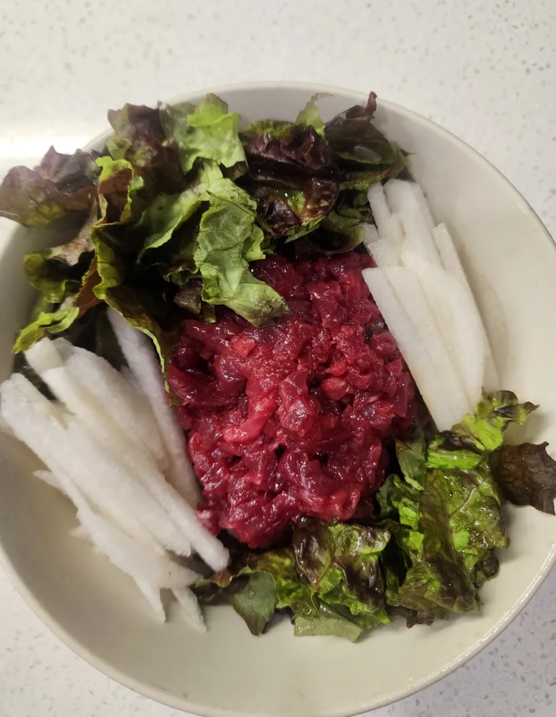 밥을 그릇에 담고 육회와 배, 상추를 적당히 올려줍니다.