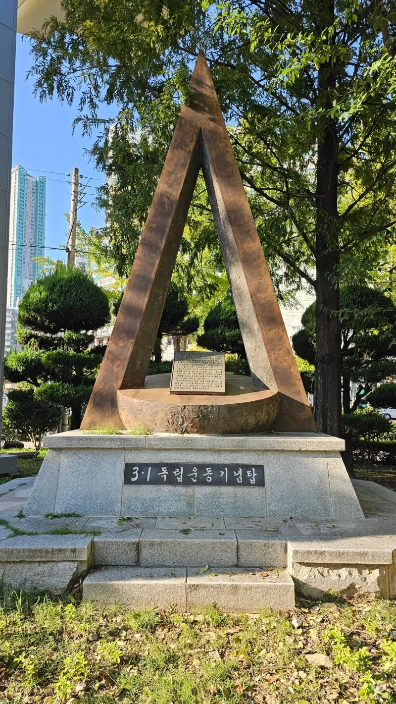 그래서 이전 장소인 양덕동 삼각지 공원을 어느 날 찾아갔어요. 삼각지 공원 내 한쪽으로 이전된 3.1 독립운동 기념탑을 한참 걸려 찾았습니다.