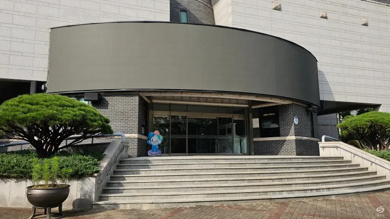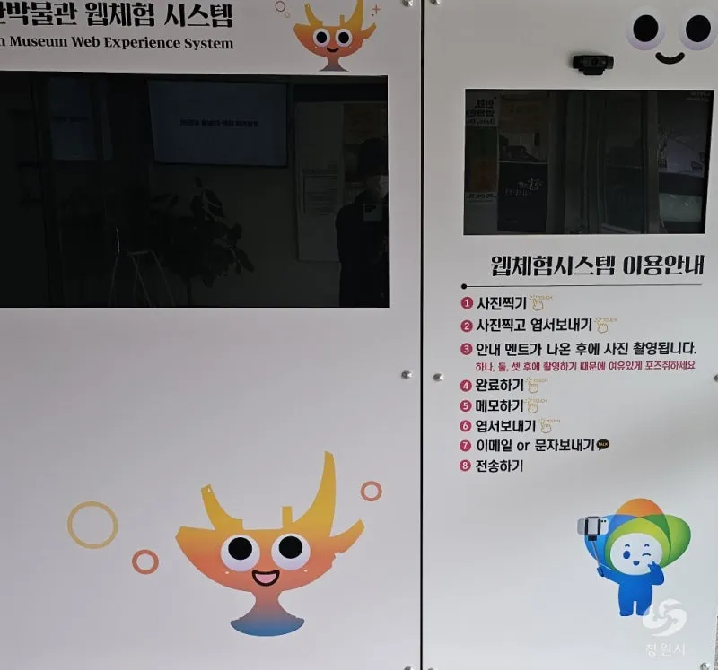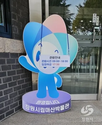 박물관 주출입 문에 관람 안내 정보를 알리는 마스코트 입간판이 환영하고 있습니다.