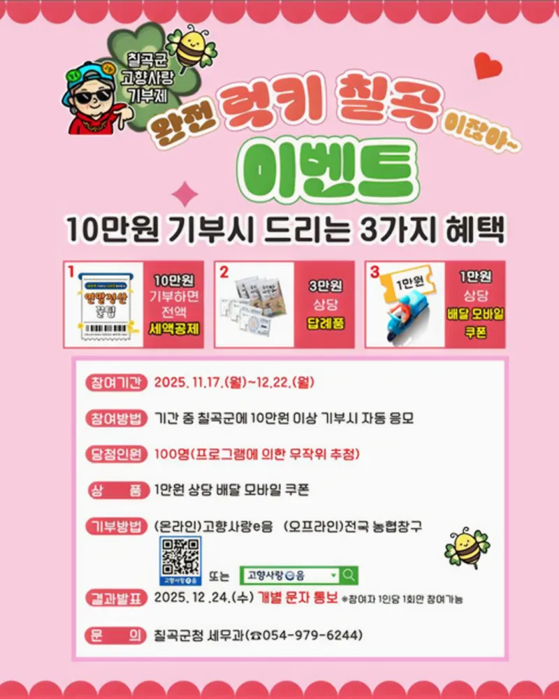 #칠곡군 #럭키칠곡 #고향사랑기부제 #고향기부 #고향사랑e음 #고향사랑기부제이벤트 #기부이벤트 #세액공제혜택 #답례품추천 #기부문화 #행복한기부 #소확행기부