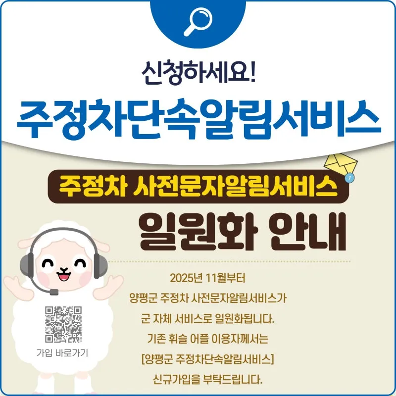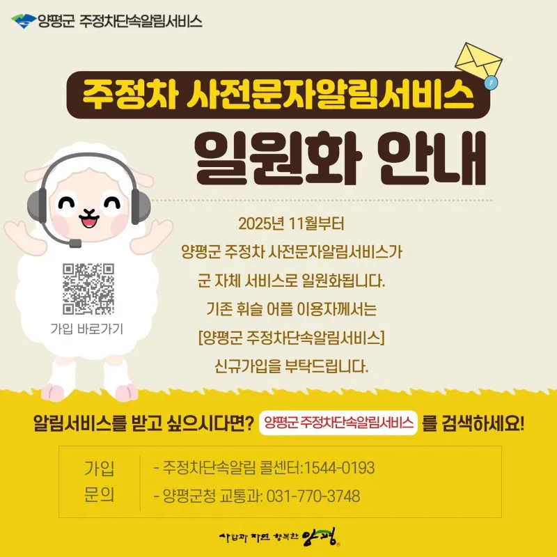 양평군 주정차 사전문자알림서비스 일원화 안내