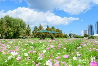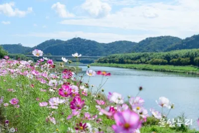 삼호교 구간 강변 산책로부터 걸으려고 산책로로 내려서니, 산책로를 따라 약 1.4km 구간에 줄지어 핀 코스모스가 먼저 눈에 띕니다.