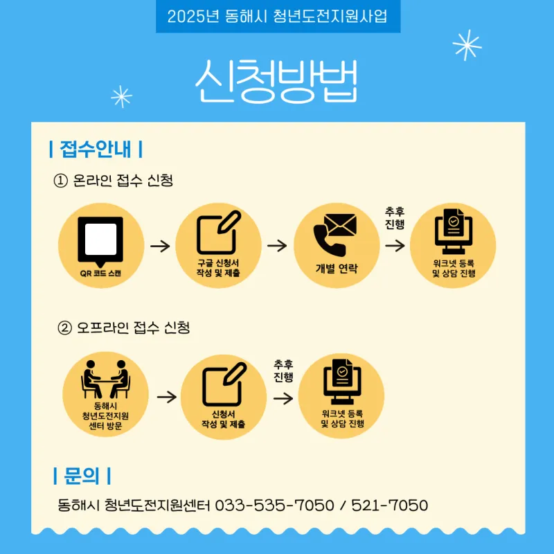 - 오프라인: 동해시 청년도전지원센터 방문 접수(효자로 691, 동성프라자 3층 301호)