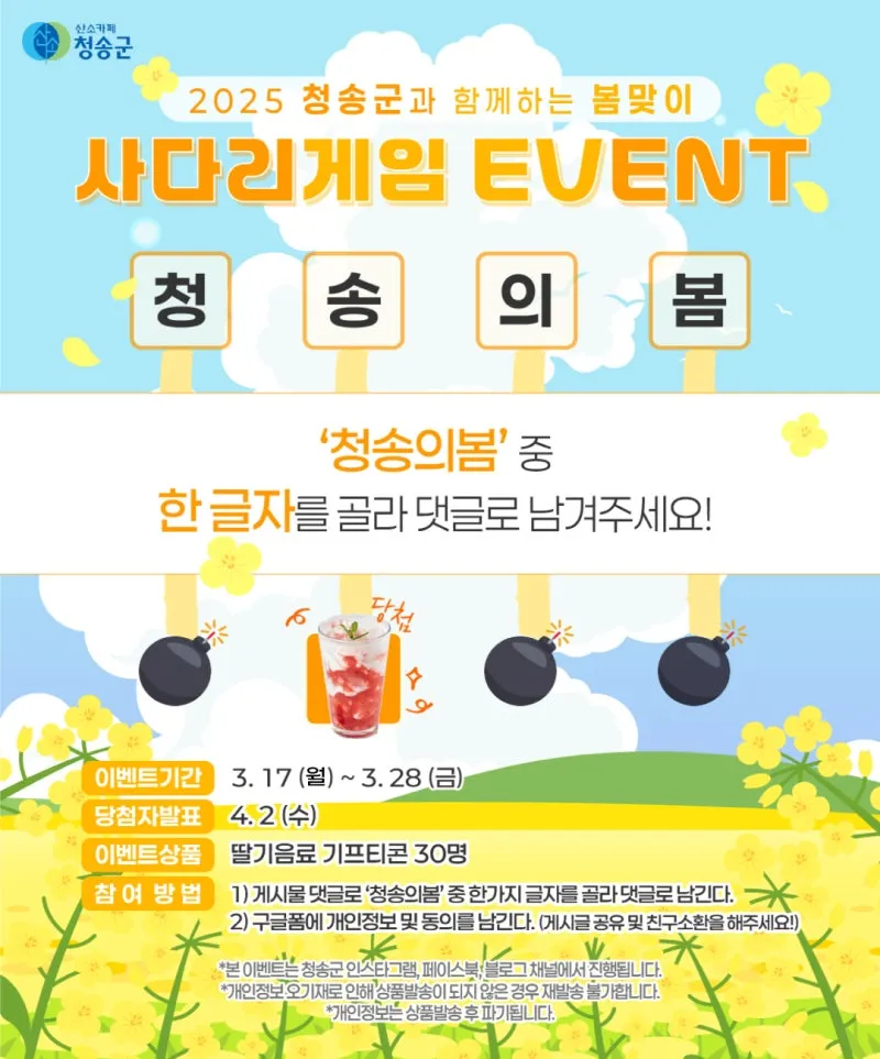 '청송의봄'중 한 글자를 골라 댓글로 남겨주세요!💗 추첨을 통해 맛있는 딸기음료 기프티콘을 선물로 드려요 :) ✔️ 이벤트기간: 3월 17일 월요일 ~ 3월 28일 금요일 ✔️ 당첨자발표: 4월 2일 수요일 ✔️ 이벤트상품: 딸기음료 기프티콘 30명 ✔️ 참여방법 1.개시물 댓글로 ‘청송의봄’ 중 한가지 글자를 골라 댓글로 남긴다. 2.구글폼에 개인정보 및 동의를 남긴다. (게시물 공유 및 친구소환을 해주세요!) *본 이벤트는 청송군 인스타그램, 페이스북, 블로그 채널에서 진행됩니다. *개인정보 오기재로 인해 상품발송이 되지 않은...