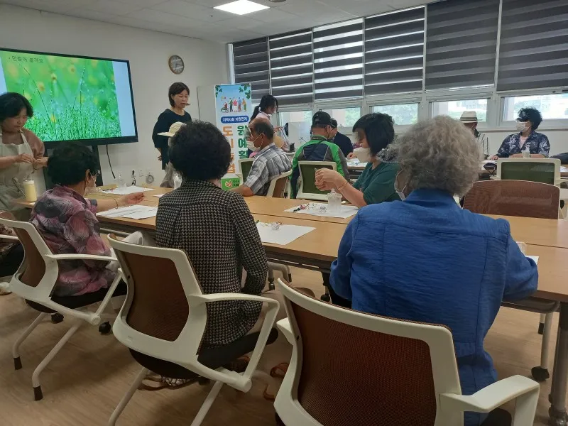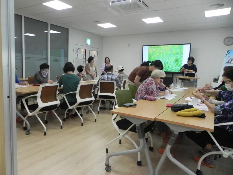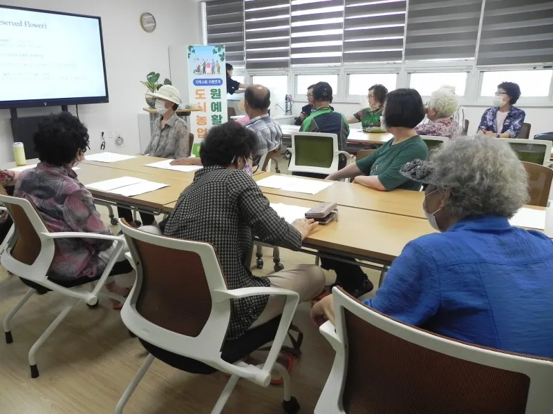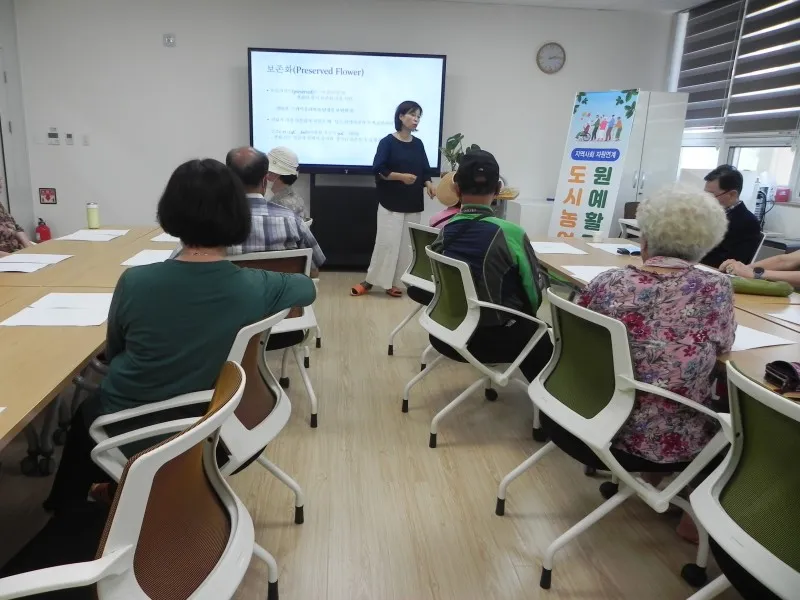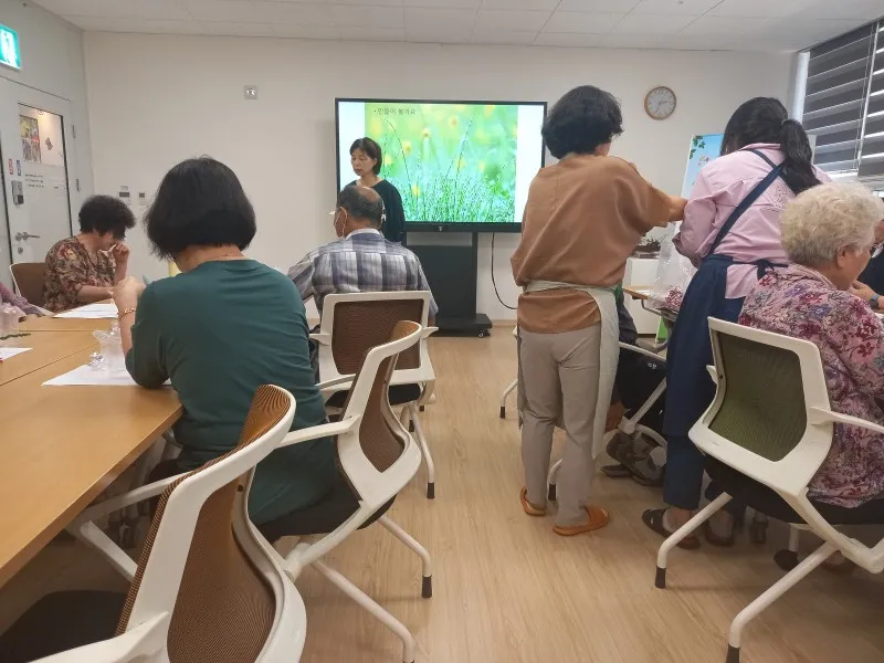 원예 활동 교육은 꽃과 식물로 만드는 하바리움 만들기 강좌였는데요. 많은 회원이 강좌에 참여하고 있었습니다.