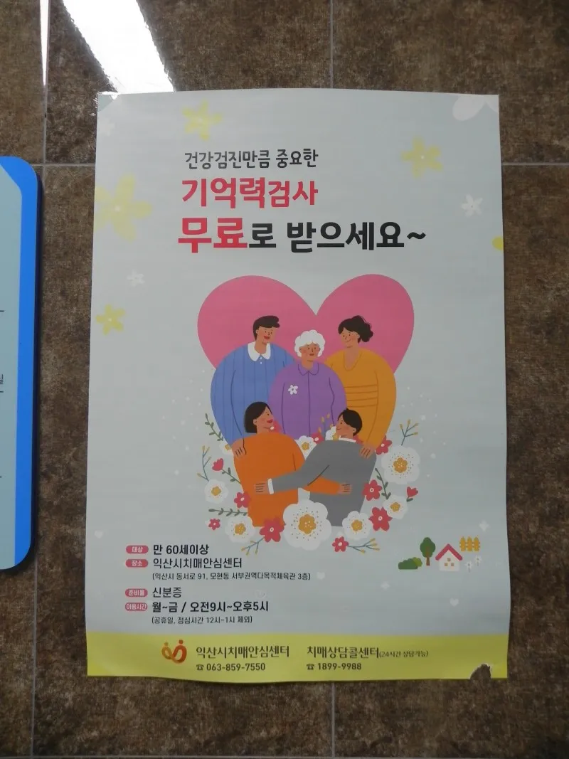 엘리베이터를 타면 건강 검진 만큼 중요한 기억력 검사를 무료로 받으세요 라는 포스터도 붙어있어 치매안심센터임을 알려주고 있습니다.