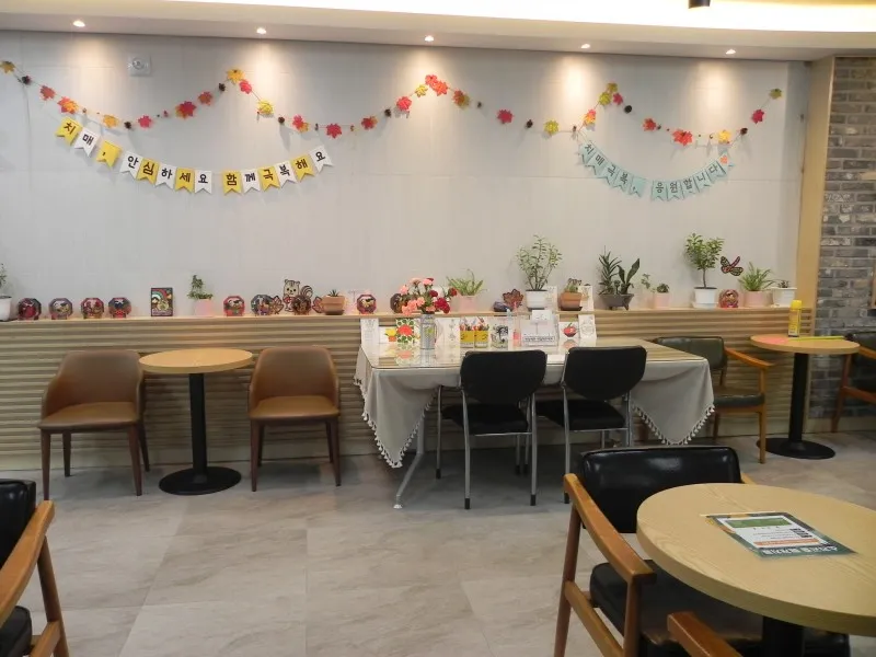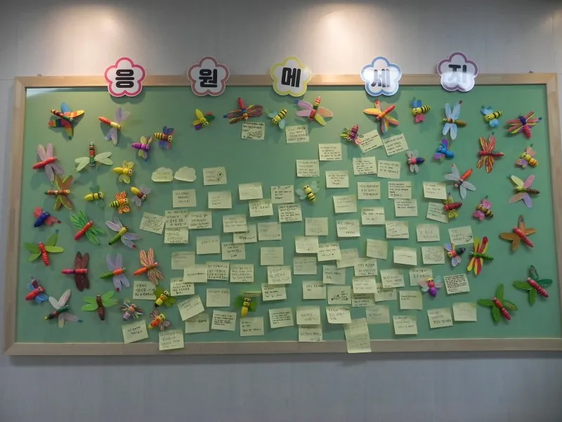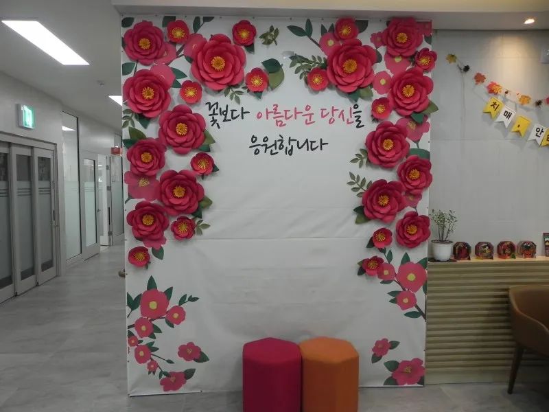 다양하고 희망찬 응원 메시지가 꽃목걸이를 찬 하트 액자 안에 걸려있어 치매 센터인데도 맘이 편 합니다.