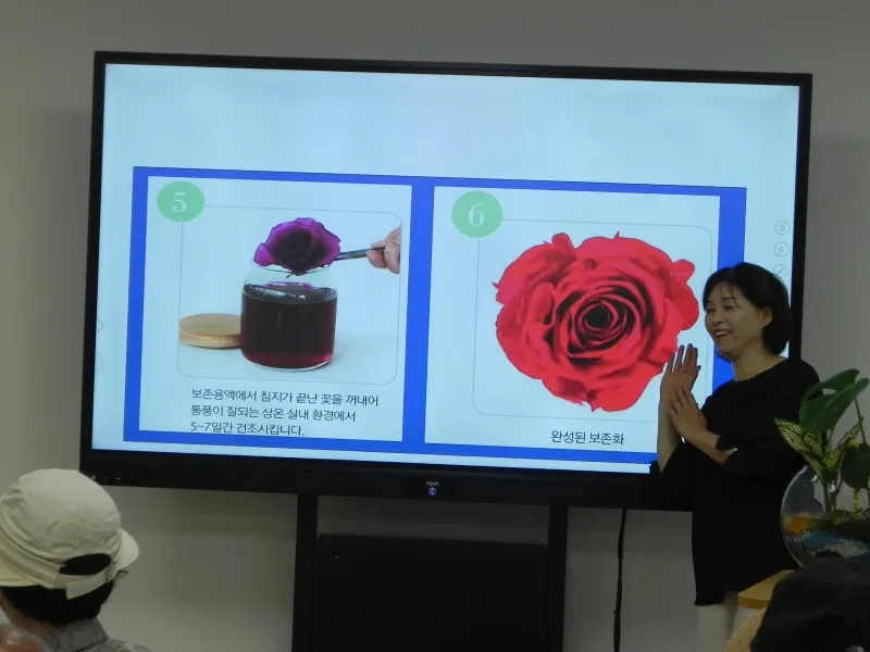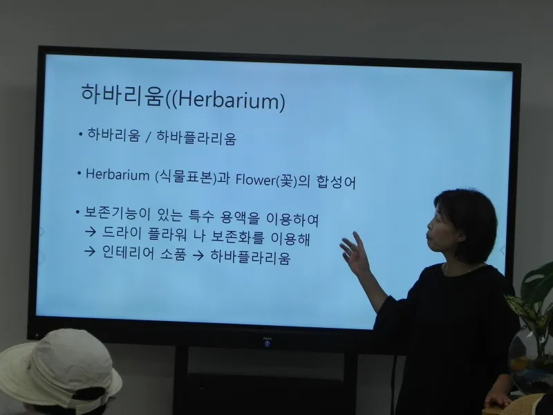 유리 용기 등에 넣는 과정과 꽃과 식물 선별, 특수용액 소개 등등 자세하게 강사가 설명하고