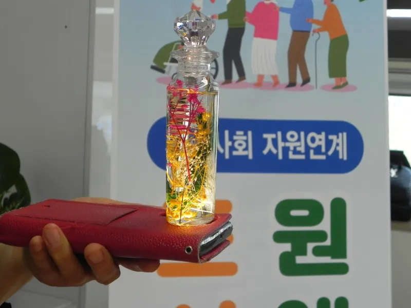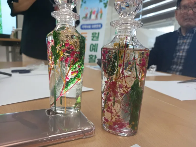 말려서 색깔을 입힌 아름다운 꽃과 식물을 유리 용기 안에 넣은 후 특수용액을 부은 다음 마개를 닫으면 끝인데요.