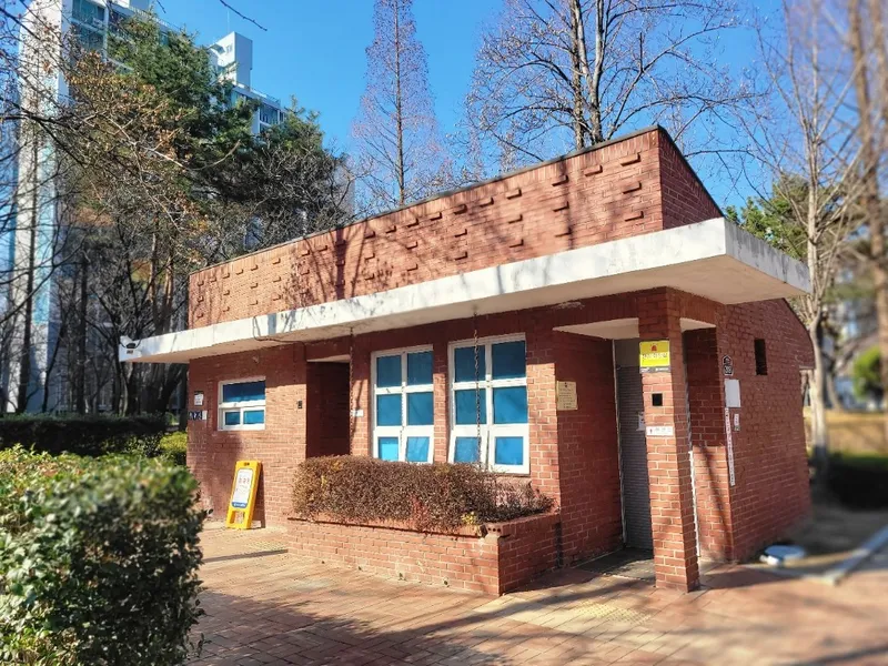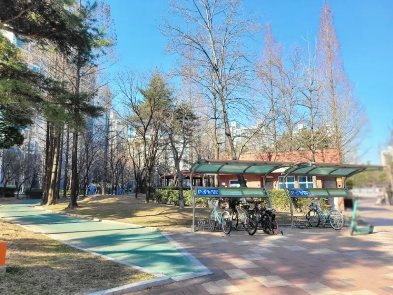 공원에는 공용화장실이 있고 그 옆에는 자전거를 주차할 수 있는 자전거 주차장이 있었고 모래 놀이터가 있습니다.
