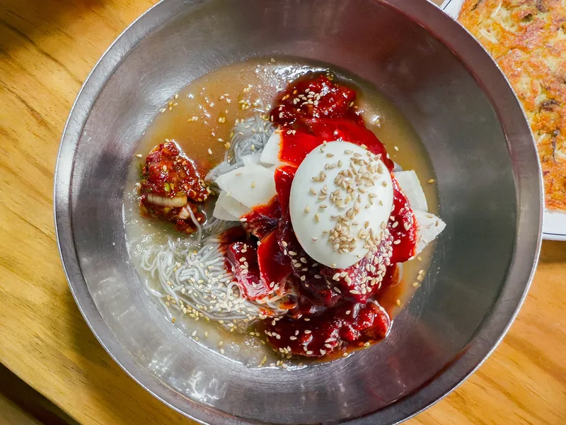 회냉면은 매콤한 맛이 일품이라 돼지비계기름을 사용해 부쳐내어 바삭하면서도 깊은 풍미가 느껴지는 녹두빈대떡과 정말 잘 어울리는 맛입니다.