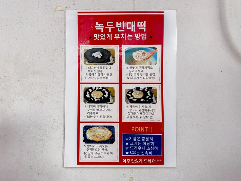 사장님이 친절하게 굽는 방법도 설명해 주시고, 여유가 있을 때는 직접 구워주시기도 하여 걱정 없이 음식을 즐길 수 있습니다. 노릇하게 구워진 녹두 빈대떡의 바삭한 겉과 촉촉한 속, 고소한 맛은 자꾸 생각나는 맛이기도 합니다.