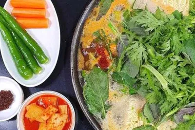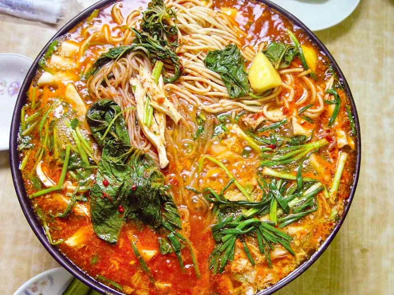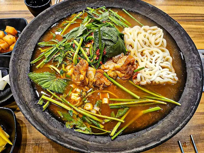 얼큰하고 뜨끈한 국물에 닭고기, 신선한 채소, 당면이 어우러지며
