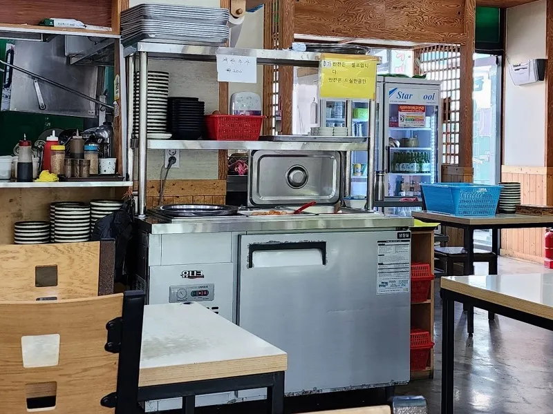 여기에 일반적인 콩나물국밥집에서 볼 수 있는 #어린이떡갈비 #메밀전병 #오징어한마리 #만두 등 곁들임 메뉴도 풍성하게 즐길 수 있겠더라고요. 반찬은 첫 서빙 이후부터 셀프 코너를 이용할 수 있습니다.