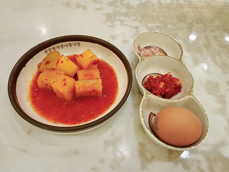 #대전국밥맛집 24시전주명가콩나물국밥 반찬은 단촐한 편이지만, 깍두기와 새우젓, 오징어젓 등 콩나물국밥에 없어서는 안 될 찰떡궁합 반찬으로만 구성되어 있습니다. 여기에 날계란 또한 제공되며, 계란 추가는 200원입니다.