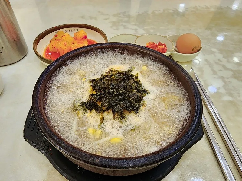 날계란이 뜨거운 국물과 만나자 금세 반숙이 됩니다. 이 맛이 진정한 #전주콩나물국밥 아니겠어요?