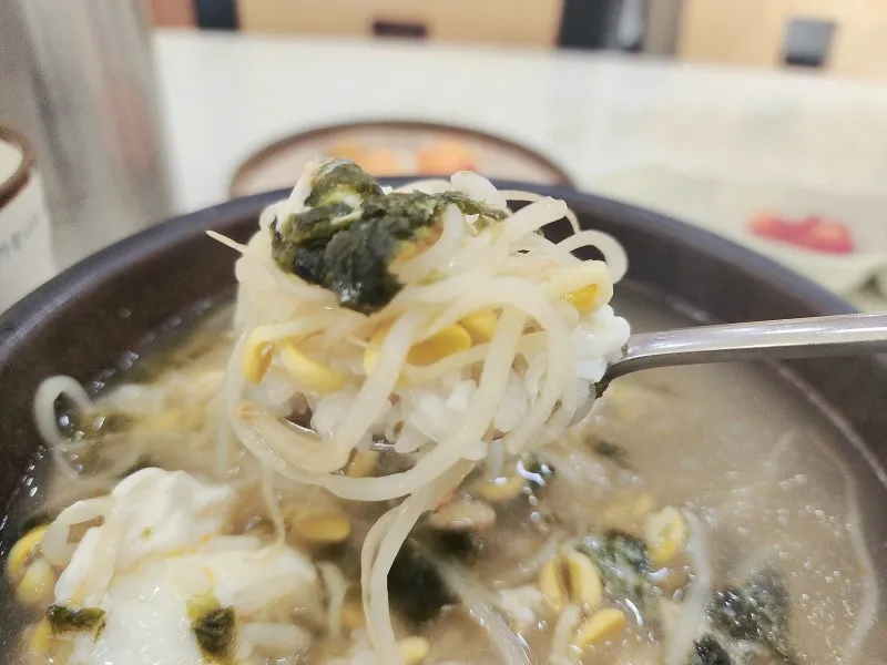 우선 맑은 국물과 함께 국밥 한 입 해봅니다. 시원하고 깔끔한 국물 맛이 해장할 속이 아님에도 불구하고 해장이 되는 묘한 매력이 있습니다. 아삭아삭 콩나물 또한 풍성하게 들어있는데요. 콩나물국밥은 다른 건더기가 들어있지 않아도 정말 맛있는 음식이 아닐까 싶습니다.