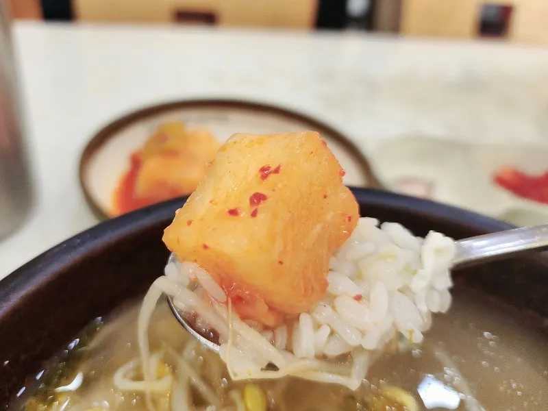 반찬과도 함께 먹어볼까요? 콩나물국밥에는 잘 익은 김치만 있으면 충분합니다. 아삭하고 새콤한 깍두기를 한 입 베어 물 때마다 콩나물국밥과 너무 잘 어우어져 맛있게 먹을 수 있었습니다.