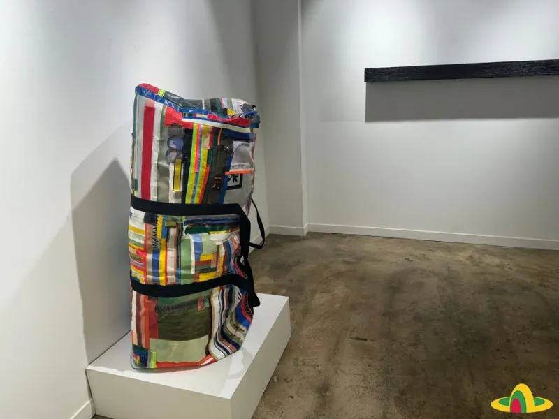 멀리 김태연작가님의 ‘가치’와 쓰임‘에 대한 질문인 작품이 보이네요. 작가님은 짜임을 가진 비닐포대를 풀어낸 실로 다시 직물을 짜서 포대를 만드셨습니다.