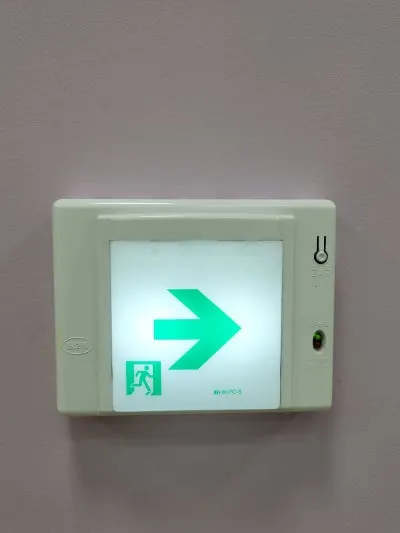 어두움 속에서 비상등이 가리키는 쪽으로 나가야 안전하게 탈출할 수 있어요.