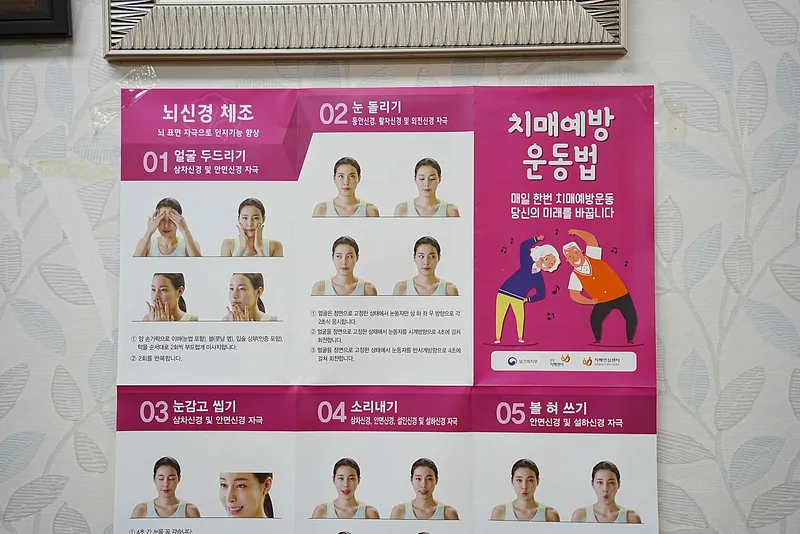 대덕구 치매안심센터 에서는 어르신들을 위해 치매예방운동법을 가르쳐 드렸으며, 경로당 한쪽 벽면에 커다란 전단지도 붙여놓았습니다. 아마도 내일부터 어르신들은 얼굴 두드리기부터 시작하여 볼 혀 쓰기 까지 따라해 보시면 좋을 것 같습니다.