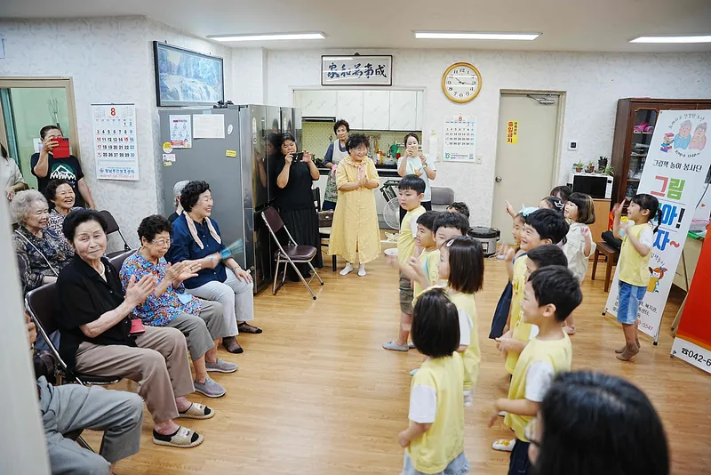 경로당 어르신들과, 대덕구 샬롬어린이집 아이들이 한자리에서 세대를 떠나 즐거운 시간을 보냈으며, 이 시간은 그림책아놀자 봉사단과 송촌동문고, 그리고 대덕구 치매안심센터와 샬롬어린이집이 함께 기획하여 만든 시간입니다.