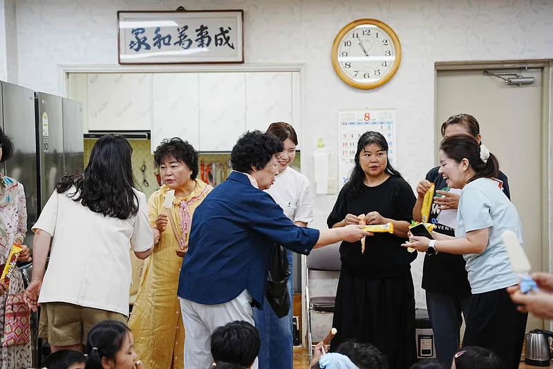 경로당 안에서는 시원한 아이스크림을 나누어 주었습니다. 고생하신 여러 선생님들도 잠시 아이스크림을 드시면서 담소를 나눌 수 있었습니다.