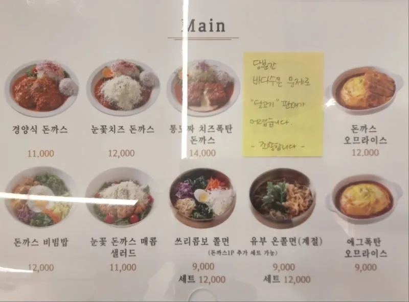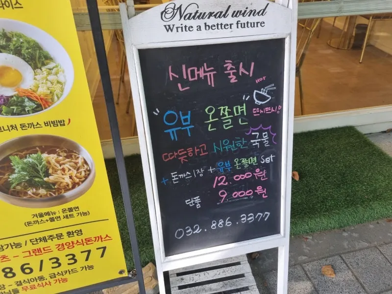 방문해서 가게를 보니까 외부 간판에는 수제 돈까스 전문점이라고 쓰여 있었고, 가게 앞에는 메뉴 소개 팜플렛과 안내사항이 적혀져 있는 판이 설치되어져 있었는데요. 따듯하고 시원한 국물과 함께 먹을 수 있는 유부 온쫄면이라는 신 메뉴 출시에 관한 사항 그리고, 신 메뉴로 출시한 유부 온쫄면을 단품으로는 9,000원 돈까스 1장이 추가된 세트는 12,000원에 저렴하게 먹을 수 있다 라는 말과 전화번호가 적혀져 있었습니다.