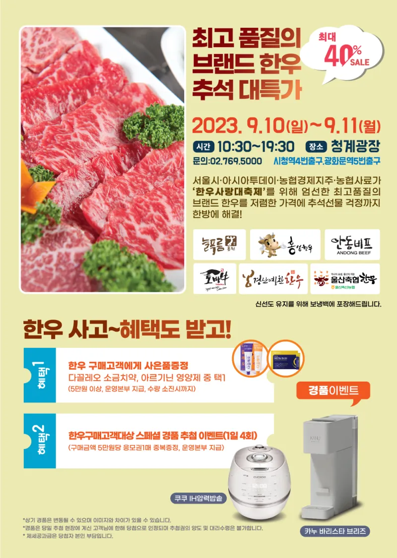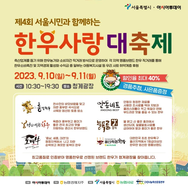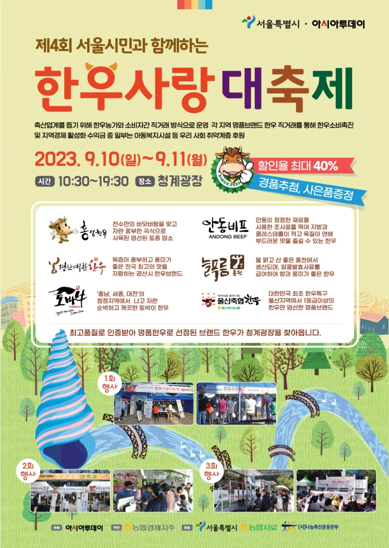 서울시민과 함께하는 제4회 한우사랑대축제 · 주최 : 아시아투데이 · 주관 : 농협경제지주 · 후원 : 서울특별시, 농협사료, (사)나눔축산운동본부 · 일시 : 2023년 9월 10일~11일(10:30 ~ 19:30) · 장소 : 서울 청계광장 |