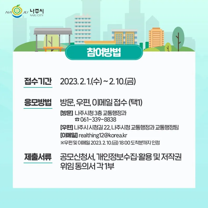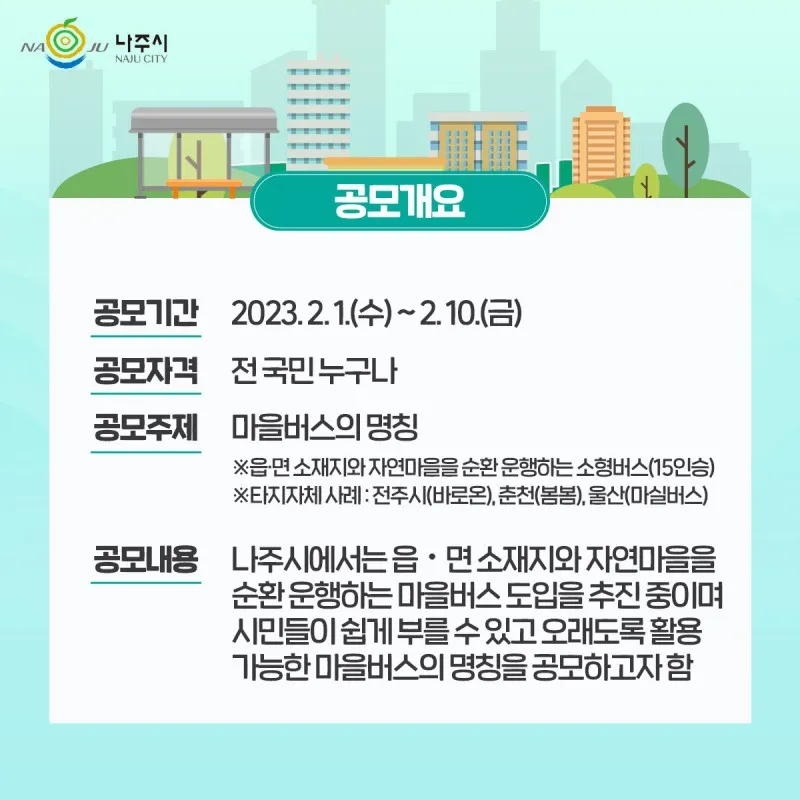 대중교통 노선개편에 따라 시민들이 쉽게 부를수 있고 오래도록 활용가능한 명칭을 붙여 나주시의 경쟁력 있는 이미지를 구축하고자 다음과 같이 공고하오니 많은 참여 바랍니다. 가. 공 모 명 : 나주시 대중교통 노선 개편에 따른 마을버스 명칭 공모 나. 공모기간 : 2023. 2. 1.(수) ~ 2. 10.(금) [10일간] 다. 공모자격 : 전 국민 누구나 라. 공모주제 : 마을버스의 명칭 마. 응모방법 : 방문(나주시청 교통행정과 교통행정팀), 우편, 이메일 접수(realthing12@korea.kr) 바. 제출서류 : 공...