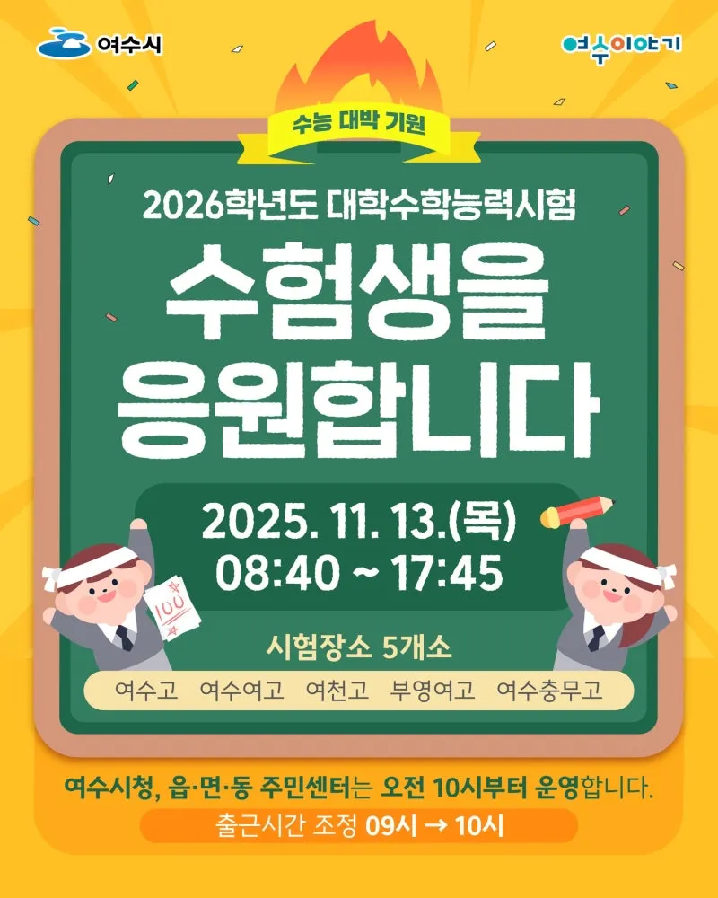 {"title":"2026학년도 대학수학능력시험 안내","source":"https://blog.naver.com/yeosu_city/224070010775","blogName":"여수시 공..","domainIdOrBlogId":"yeosu_city","nicknameOrBlogId":"여수이야기","logNo":224070010775,"smartEditorVersion":4,"lineDisplay":true,"outsideDisplay":true,"blogDisplay":true,"cafeDisplay":true,"meDisplay":true}