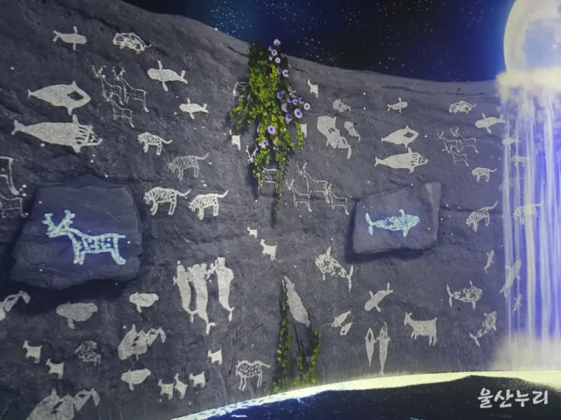 신석기 시대~청동기 시대 초기 제작된 암각화로 고래, 사슴, 호랑이 등 300여 점의 동물과 사냥 장면이 새겨져 있어요.