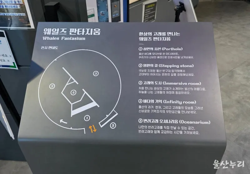 1. 심연의 시선 울산 바다를 모티브로 한 미디어 아트로 여러 가지 신비한 배경이 특징입니다. 2. 염원의 길 국보로 지정된 울산 반구대 암각화에서 고대부터 이어지는 염원의 길을 경험할 수 있어요. 3. 고래의 도시 처음 만나는 환상의 고래가 소개하는 울산의 아름다움. 하늘을 나는 고래들의 여정을 볼 수 있습니다. 4. 바다의 기억 울산의 과거, 현재, 그리고 고래들의 모습을 그려낸 신비로운 기억의 조각 이야기입니다. 5. 반려 고래 오셔나리움 나만의 반려 고래를 직접 만날 수 있는 공간입니다. |