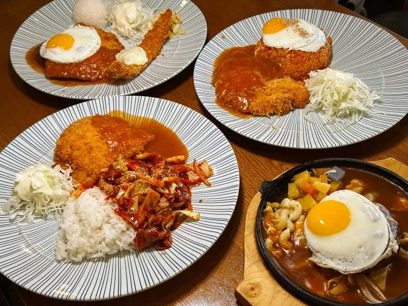 짜자잔~ 사진에서도 느껴지는 이 영롱함...⭐ 왼쪽 위에서부터 시계방향으로 행운정식, 김치볶음밥+돈까스, 함박스테이크, 불제육덮밥+돈까스가 나왔어요.