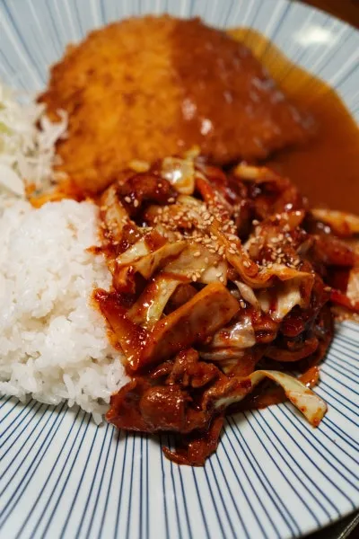 참고로 점심시간(11:00~15:00)에 오면 저렴한 가격에 두 가지 메뉴를 먹을 수 있는 점심특선이 있다는 사실❗❗ 다 맛있을 것 같아서 고민만 오백 번 하다가 불제육🔥과 김치볶음밥으로 골랐구요. 여러분께 다양한 조합을 소개해드려야 한다는 의무감에 어쩔수 없이 함박스테이크도 하나 추가했습니다😇