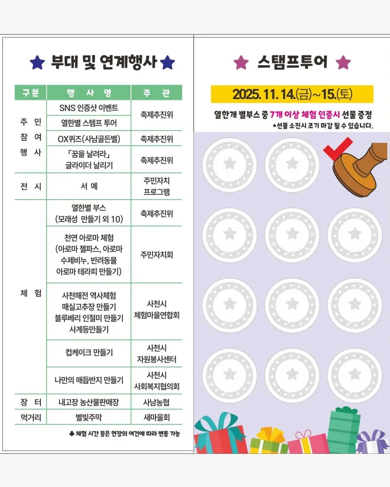 농산물 판매 / 별빛노래자랑 / 비행기날리기 / 사남골든벨