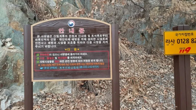 차량통행이 제한되는 차단기 구간부터 본격적인 약수터길이 시작되는데요, 이때 진입로 양옆으로 낙석위험과 관련된 수많은 표지판이 세워져 있어 조금 당황하실 수 있을 것으로도 보입니다. 보납산 약수터길은 바위산으로 이루어진 보납산 하단부에 위치한 곳이라 겨울에서 봄으로 넘어가는 해빙기와 여름 집중호우시 낙석사고가 빈번하게 발생되어 왔는데요, 무엇보다도 이곳은 마을주민들이 자주방문하는 곳인만큼 대책 마련이 늘상 강구되어왔고 이에 대한 예방책으로서 최근 낙석방지용 울타리와 그물망이 위험지구 곳곳에 설치되어 이전보다는 덜 위험한 상태에서 산책을 즐기실 수 있게 되었습니다. 다만 이같은 위험방지시설이 설치되었다하더라도 낙석위험구간을 지나실때 돌부스러기가 떨어지는 소리 등 붕괴의 징후가 보이면 즉시 대피바라며, 위험징후가 보이지 않아도 돌무더기가 쌓여있는 특정 구간은 최대한 신속하게 피해가는 것이 안전하니 이부분은 꼭 참고해주시길 바랍니다.