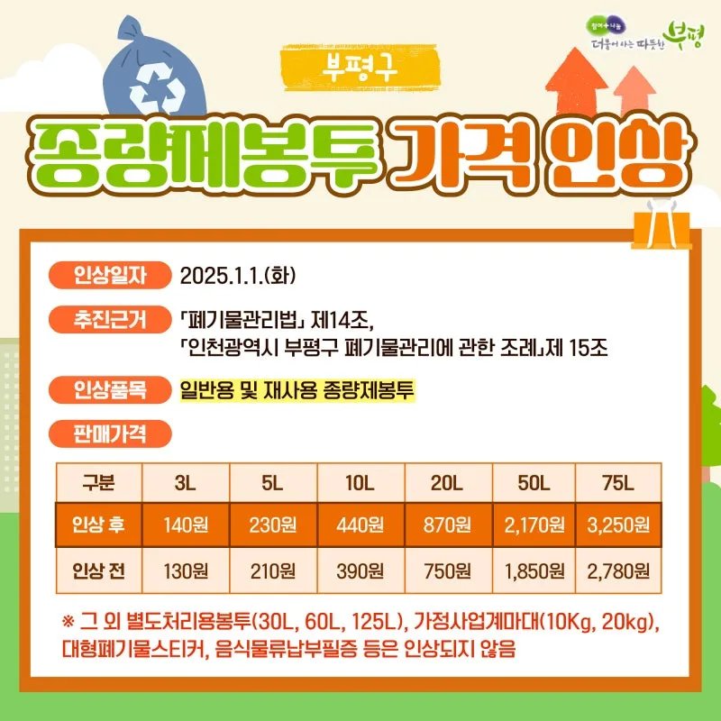 대형폐기물스티커, 음식물류납부필증 등은 인상되지 않음