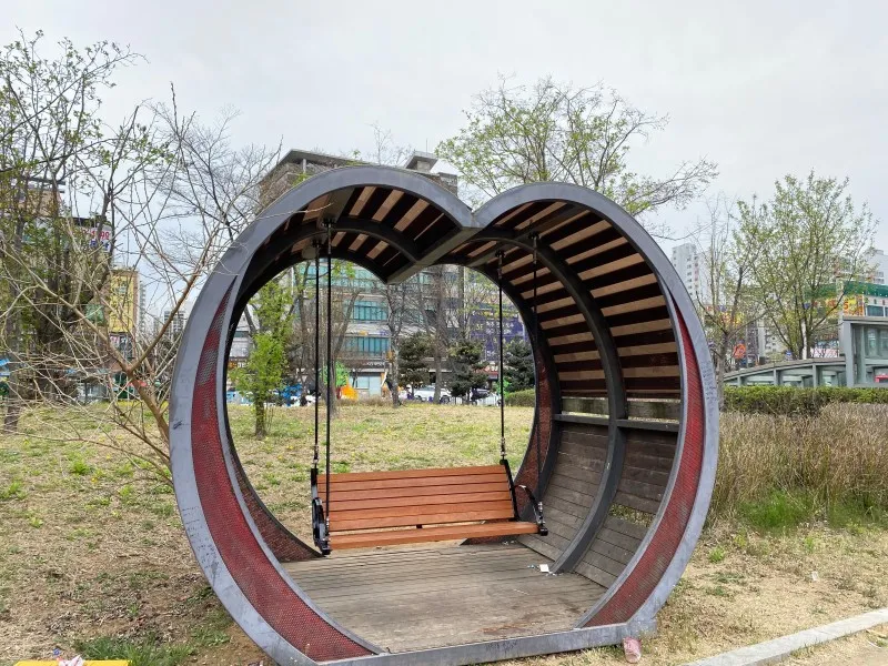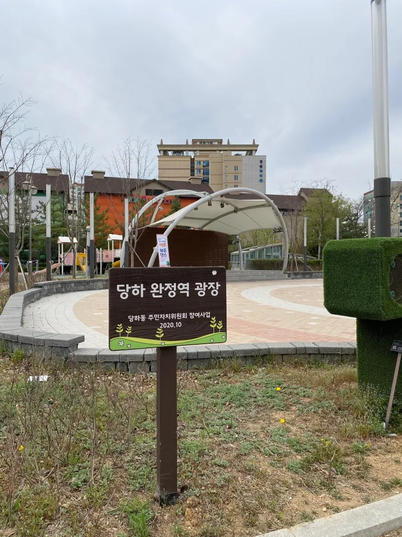 바로 당하동 주민자치위원회의 참여사업인 ‘당하 완정역 광장’으로 가볍게 하기 좋은 운동기구부터 앉아서 쉴 수 있는 휴식공간과 아이들이 놀 수 있는 작은 놀이터, 사진을 찍기 좋은 포토존까지 있어 지하철을 기다리며 쉬어가기 딱 좋은 공간이랍니다.