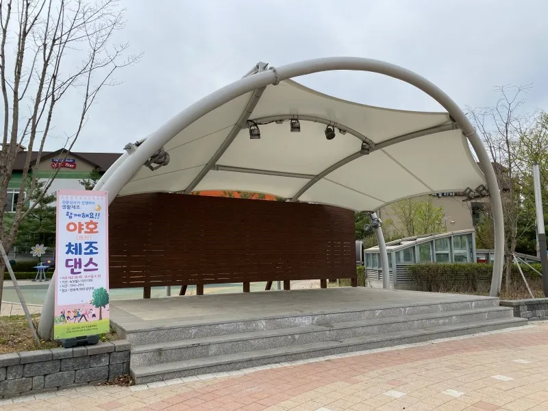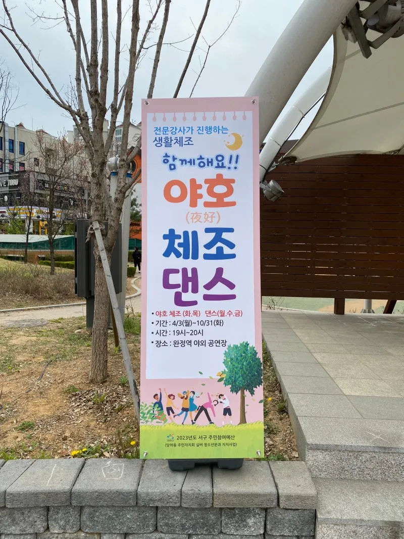뿐만 아니라 여러 프로그램도 이곳에서 진행되고 있습니다. 광장 중앙의 무대에서 4월 3일부터 10월 31일까지 전문 강사분과 함께 할 수 있는 야호체조와 댄스에 참여할 수 있다고 해요. 시간은 오후 7시부터 8시까지 총 1시간동안 진행되니 관심이 있으신 분들은 완정역 1번출구의 당하 완정역 광장으로 와주세요~