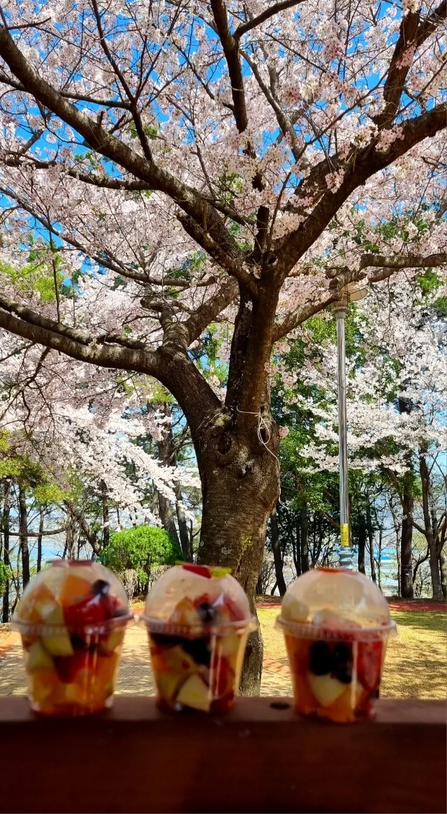 꼼꼼쟁이 지인은 신선한 과일을 잘라 과일컵을 준비했습니다. 그 고마운 마음을 담아 벚꽃뷰에 함께 담아보았습니다.