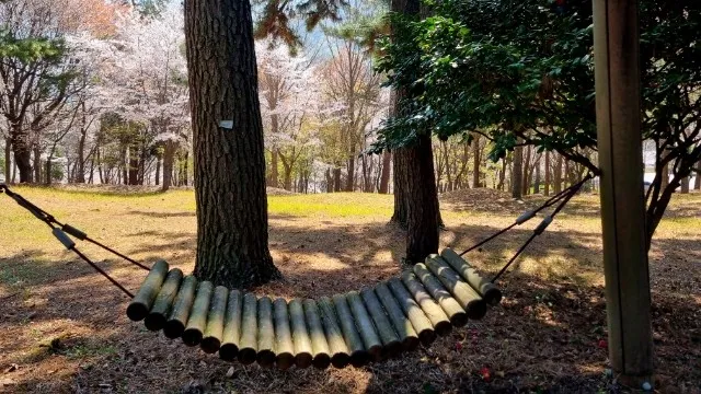 통나무 흔들그네는 동백나무 아래 자리하고 있어서 곧 더워지는 계절에 많이 이용되어질 공간입니다.