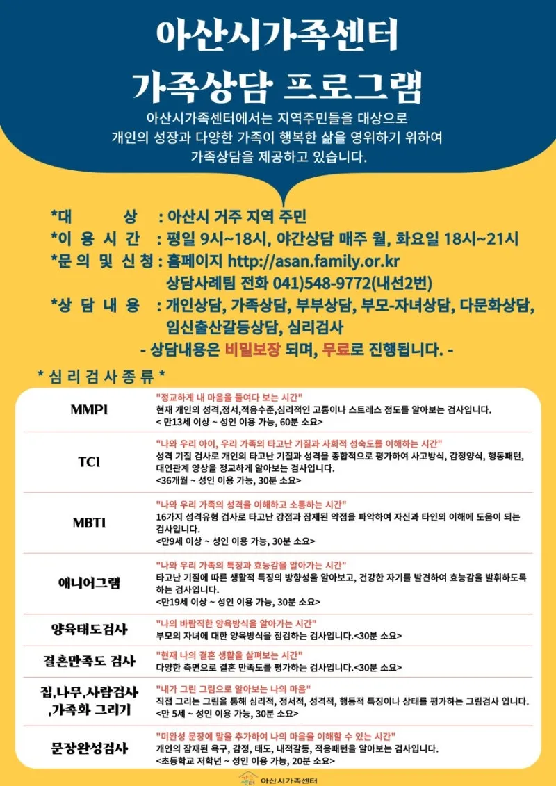 내용 : 개인/부부/부모-자녀/가족상담과 심리검사(성격, 양육태도검사 등) 진행